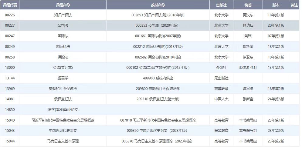 浙江省自考法学专业用书目录