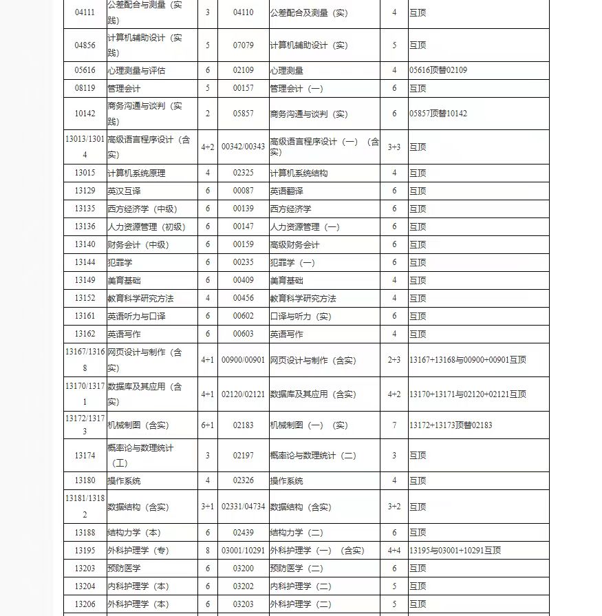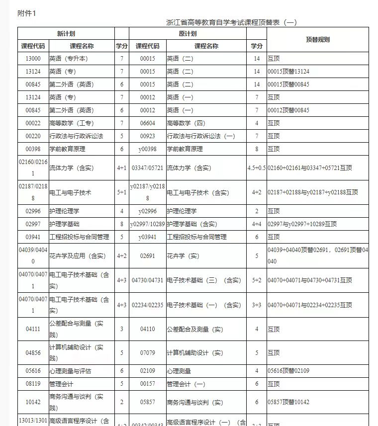 浙江省教育考试院关于调整和归并高等教育自学考试专业代码和名称等事项的通知》(浙教试院[2018〕74号)中所列专业计划(简称原计划)和《浙江省教育考试院关于公布〈浙江省高等教育自学考试专业考试计划(2023年)〉的通知》(浙教试院[2023]105号)中所列专业考试计划(简称新计划)中符合规定要求的课程,考生可在毕业申请时进行顶替,顶替规则详见《浙江省高等教育自学考试课程顶替表(一)>>(附件1)。其他与新计划课程代码,名称不同的不能按规定顶替的课程,可以在新计划选考课中使用一次。