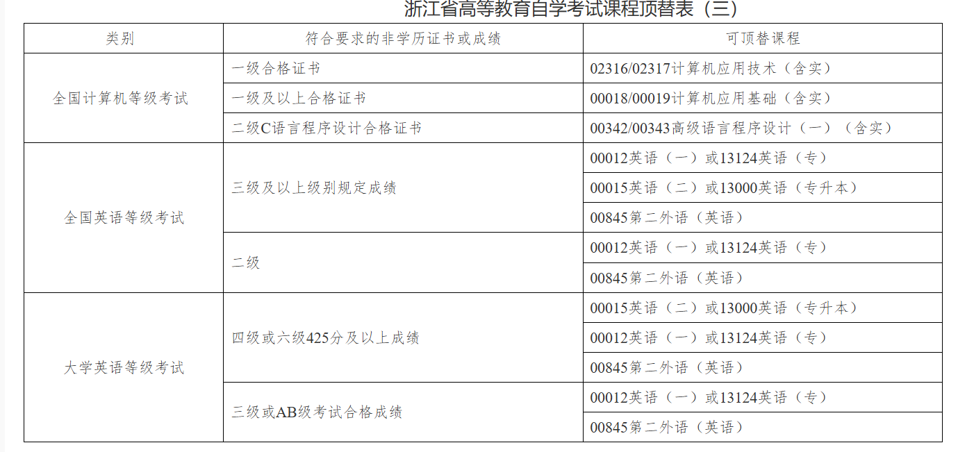 符合规定要求的非学历证书或成绩可以顶替专业考试计划中相应课程,顶替规则详见《浙江省高等教育自学考试课程顶替表(三)》。以非学历证书或成绩顶替的课程成绩记为“合格”